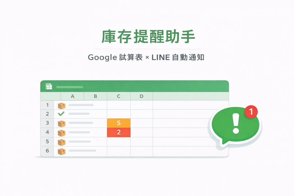 用 Google 試算表就能跑的庫存不足自動提醒工具。 庫存快用完時,透過 LINE 或 Telegram 即時通知,不用一直盯表。